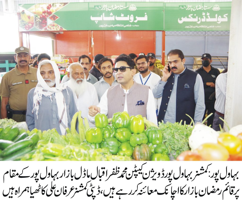 انہوں نے کہا کہ عوام الناس کو ہر ممکن ریلیف کی فراہمی حکومت پنجاب کا مشن ہے اور اس سلسلہ میں کسی قسم کی کوتاہی یا غفلت برداشت نہیں کی جائے گی ۔ انہوں نے ہدایت کی آٹا اور چینی کی وافر مقدار میں دستیابی کو یقینی بنایا جائے تاکہ صارفین کو کسی قسم کی دشواری کا سامنا نہ کرنا پڑے ۔ کمشنر بہاول پور ڈویژن نے موقع پر موجود صارفین سے گفتگو بھی کی اور اوپن مارکیٹ کی نسبت رعایتی نرخوں پر اشیائے خوردونوش کی فراہمی کے حوالہ سے استفسار کیا ۔ صارفین نے حکومت پنجاب کی جانب سے فراہم کردہ ریلیف پیکج پر اطمینان کا اظہار کیا اور مستقبل میں اس ریلیف پیکج کو جاری رکھنے کی توقع ظاہر کی ۔
