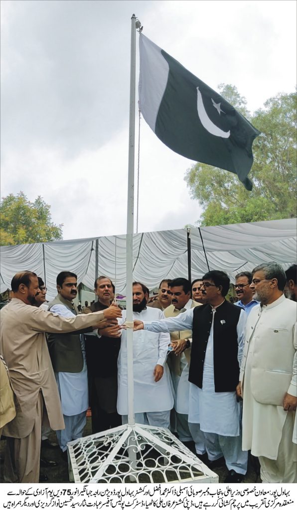 بہاول پور( اُمیدیں ٹائمز) 75 ویں یوم آزادی پاکستان کی مرکزی تقریب ڈپٹی کمشنر آفس کے سبزہ زار میں منعقد ہوئی۔تقریب میں وزیر اعلیٰ پنجاب کے معاون خصوصی و ایم پی اے ڈاکٹر محمد افضل،کمشنر بہاول پور ڈویژن راجہ جہانگیر انور، ڈپٹی کمشنربہاول پور عرفان علی کاٹھیا اور ڈسٹرکٹ پولیس آفیسر بہاول پور عبادت نثار نے قومی پرچم لہرایااوریوم پاکستان کی گولڈن جوبلی کا کیک کاٹا۔